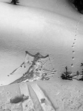 | 9502 | すっかり暖かくなってきて、もう太平洋側では雪が降ることも無くなったと思いますが、あらためて雪ならではのこんな写真を紹介しましょう。![]() どういう状況に陥ったのか、一目でわかる写真ですね。起き上がった後にどうしたのかは隠れていて分かりませんけど、おそらく向かって左の方へ滑って行ったんだと思います。気になるのは右端に続いてる動物の足跡ですけど、スキーヤーが倒れてるのを横目に、我関せずとばかりに奥の方へ消えて行ったのか、それともバカな人間が盛大にこけてやがるぜ!と思いながら行ったのか、あるいはこの足跡に惹かれてこの哀れなスキーヤーが窪みの下に落ちて行ってしまったのか、いろいろ想像が膨らむ1枚です。というわけで、今日からしばらくは冬ならではの「跡」を紹介します。 |