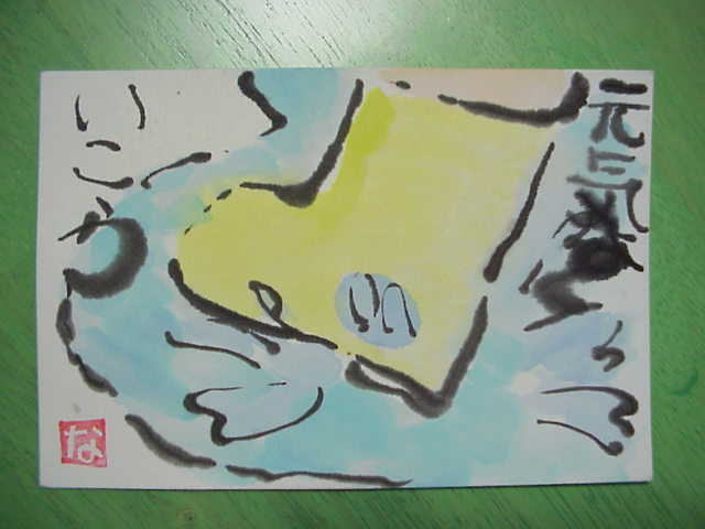 | 7月19日(月) 一体、私の一日って、こんなんで、いいのかなあと思う。まず、中休みは、うさぎのクローバーを摘み、昼休みは、子どもたちと一緒に砂場で穴をほったり、トンネルを作ったり、 プールの時間は、「もぐり鬼」をして、放課後は、蜘蛛の巣にひっかかった、オニヤンマの救出に燃え(慎重にはがして、からまった蜘蛛のいとをちょっとずつとった。)、夕方は、 西の空に光る金星をぼうっと見る。帰りは、うさぎに「さようなら」を言って、朝顔にお水をかけて、帰りに寄ったコンビニの子犬と戯れる。 私って、ついこの前まて、星の名前なんて知らなかったし、動物に触れなかったし、 虫は、大っ嫌いだったし、土とかぬるぬるしたものに触れなかったし、1年生担任になって、ずいぶん変わったなあと、自分でもびっくりしている。 あっ、そうだ、なっちゃんから、絵手紙が届いたので、見せまーす。 なんか、元気がでるでしょ。 |