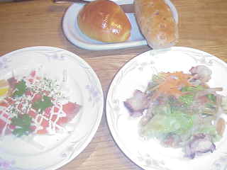朝の残りのパンにはさめた具でサラダ。キウィ。