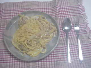 →パスタ入れる→火をとめて卵黄を入れてまぜる)