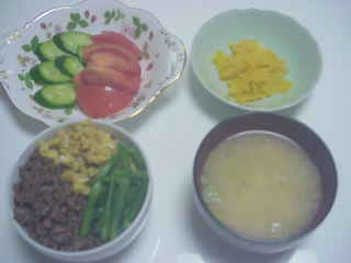 今日は三色そぼろご飯とお味噌汁、野菜サラダ。