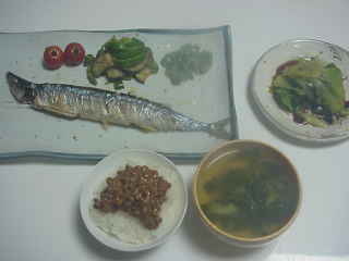 さんま・納豆ご飯・お味噌汁・たこわさび・なすいり・