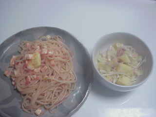 おつまみセット。たらことアスパラとモッツァレラチーズのパスタ