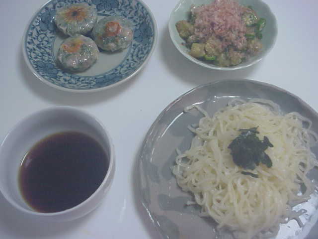 さぬきうどん、ナスとおくらのとろとろ、にら饅頭