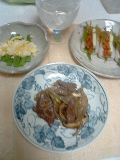 牛肉の和風炒め・さやいんげんの卵マヨネーズサラダ・キムチ入りちくわ