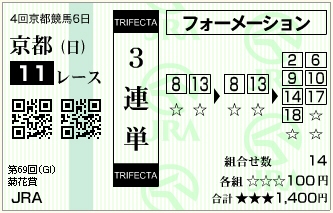 やっぱり、好調馬と実績ですか。納得のあたりです。 3連単でもよかったかも。 |