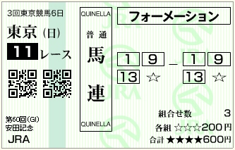 1着 13 エーシンフォワード 2着 08ダノンヨーヨー 3着 15ゴールスキー 単勝 13 5,240円 連勝 08-13 14,240円 3連複 08-13-15 53,970円 3連単 13-08-15 473,970円 |