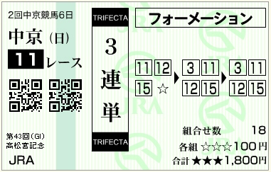 1着 08マイネルホウオウ 2着 17インパルスヒーロー 3着 12フラムドグロワール 単勝 08 3,430円 連勝 08-17 21,890円 馬単 08-17 56,570円 3連複 08-12-17 137,530円 3連単 08-17-12 1,235,600円 |