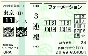 今回は馬連の当たりでした。 混戦なので、どの馬もチャンスがあると見たのが良かったかも。 ヴィブロスの差し足には感動しました。ジュエラーがあと一歩早ければ、3連複も当たっていたんだけどなー。残念。 ![]() ![]() |