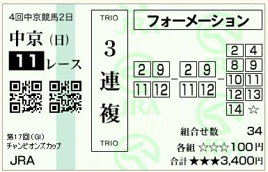 ○ | 今回は、混戦とみて、人気をまったく見ずに予想してます。 02ジュエラー 03パールコード 04パーシーズベスト 07ヴィブロス 10ビッシュ 13ワンダーピルエット の馬連BOXと 03,04,07から 02、10、13への3連複の挑戦です。自信はまったくありましぇん。 |