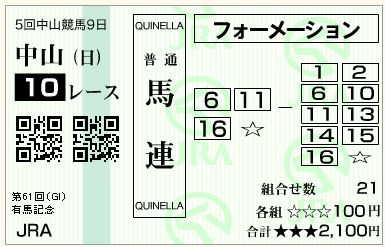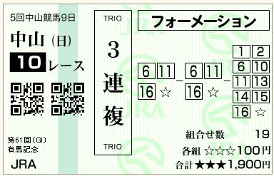 ○ | いつも通りに距離実績と騎手と親の血で決めます。 02アンビシャス 03キタサンブラック 07ラブリーデイ 16マリアライト から、 06ラストインパクト 09ドゥラメンテ 10カレンミロティック 13タッチングスピーチ 15サトノクラウン までの3連複です。 |