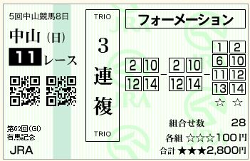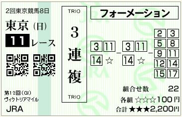 ○ | 強そうな馬とそれ以外に別れているようなレースですが、大穴のつっこみも想定して一応人気の4頭を軸に3連単とワイドで遊びます。 01ダノンプレミアム 03タワーオブロンドン 10ステルヴィオ 12ダノンスマッシュ から 04ライトオンキュー 06アサクサシンゲキ 09ムスコローソ まで。 |