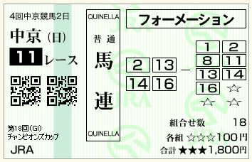 1着18ペルシアンナイト 2着11エアスピネル 3着04サングレーザー 単勝18 880円 馬連11-18 2,480円 馬単18-11 5,520円 3連複04-11-18 9,300円 3連単18-11-04 55,890円 |