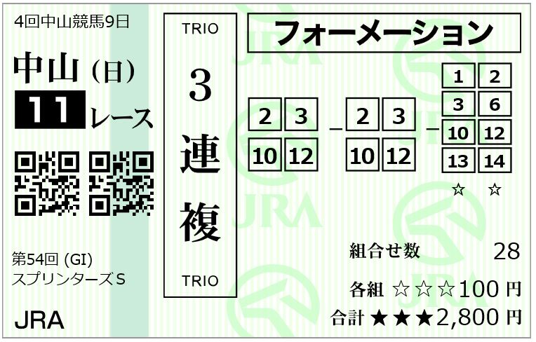 ✕ | 秋競馬スタートです。 電撃の6ハロン戦、難解も距離実績でいきます。 02モズスーパーフレア 03ダノンスマッシュ 10グランアレグリア 12ビアンフェ から 01ダイメイプリンセス 06ライトオンキュー 13レッドアンシェル 14エイティーンガール までの3連複です。 |