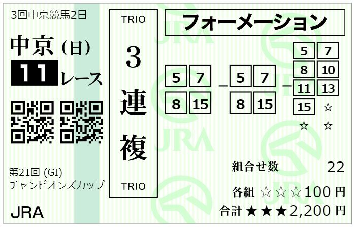 ✕ | 騎手と距離実績で 01オーソクレース 03ランドオブリバティ 10ダノンザキッド 11タイトルホルダー 12アドマイヤザーグ のBOX3連複で参加します。 自信なしです。 |