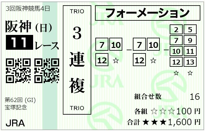 〇 | 今年もあと2レースを残すのみになりました。 距離実績と騎手で、選びます。 07クロノジェネシス 10エフフォーリア 13アカイイト 16タイトルホルダー を軸に、アナを狙って 05ディープボンド 06ウインキートス 09ステラヴェローチェ までの3連複です。 強いのが2頭いるので、穴は3着かな |