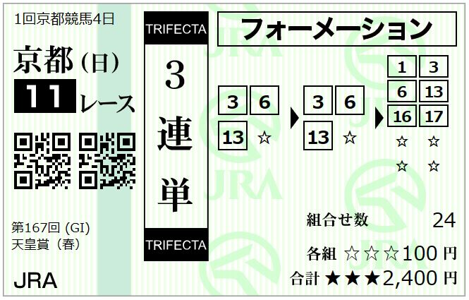 ✕ | 春の天皇賞は距離が長いので、菊花賞馬が活躍するんですね。 アスクビクターモアに期待です。 03タイトルホルダー 06アスクビクターモア 13ボルドグフーシュ を軸に 01ジャスティンパレス 16シルヴァーソニック 17アフリカンゴールド を3着狙いで遊びます。 |