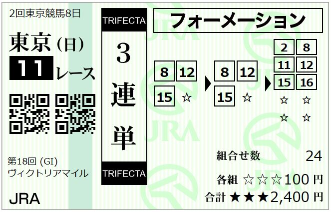 ✕ | 気をとりなおして、いってみましょう。 また、牝馬戦です。 穴を頭にしてみます。 08ララクリスティーヌ 12ナムラクレア 15ルージュスティリア を軸に 人気の 02スターズオンアース 11ナミュール 16ソダシ までの3連単です。 |