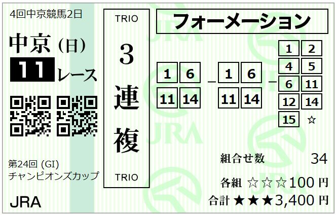 1着15レモンポップ 2着07ウィルソンテローソ 3着05ドゥラエレーデ 単勝15 380円 馬連07-15 29,040円 馬単15-07 32,020円 3連複05-07-15 469,320円 3連単15-07-05 1,902,720円 |