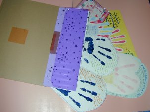 A4サイズ以下の紙に自分の手形をスタンプして、その紙に誕生日お祝のメッセージを書きそえて贈ります。紙の種類などは自由です。でもペラペラの紙よりはちょっと厚めの紙の方が安心かな?薄い紙にスタンプした後、厚紙の台紙に貼りつけてもオッケー。
