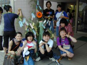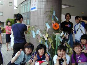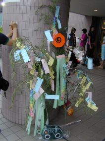 製作途中の七夕ですが、こんな感じで、後は短冊がもう少し増えました(笑) 竹はもうカラカラに乾燥しちゃってる状態だったんですけど、「おお、これはまさしく竹!」ってな具合のいい香りはしてました。 ちなみに19ロゴ入りの吹き流しは、当日朝にせこせこと作ったもの。写真じゃ少し分かり辛い虹色のものは、ミニ折り鶴が10連になっている飾りです。 |