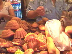 タヒチのパンといったらバケット(フランスパン)という印象ですが、こんなにいろいろなパンがありました。左はコッペパン、ふあふあでほんのり甘くておいしいです。右は「フィリフィリ」という8の字ににひねったドーナッツで家庭でもオヤツとしてよく作られるようです。 |