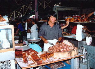 ![]() 左写真はお肉屋さん店頭にブラ下がった仔ブタちゃん(汗)。右は焼きブタ、トリ肉や肉の煮こごりを大胆に中華包丁で細かく刻んでの実演販売(?) 一食分くらいでも計り売りしてくれるのがウレシイです♪(煮こごり、大好物です!! *^¬^*) |