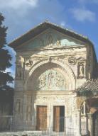 パステルカラーの彫刻で装飾された美しいファサードは、アゴスティーノ・ディ・ドゥッチョによるルネサンス様式。扉の両側に音楽を奏でる天使、半円形のタンパンには聖人と天使、最上部にはキリストの姿が彫られています。内部は簡素なゴシック様式で、4世紀の古代ローマの石棺が主祭壇になっています。