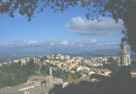 エトルリア門の左手から、入り組んだ階段と坂道を登ったところに眺めのよい広場があります。このラファエロ広場に立つサン・セヴェーロ教会は、建物は18世紀の再建ですが、内部の祈祷所にラファエロのフレスコ画「聖三位一体と諸聖人」(1505)があります。