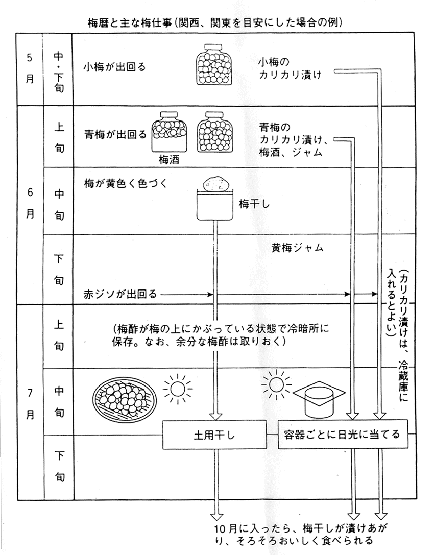 赤ジソを入れない白梅干しを作り、その後好みの量の赤ジソを入れる方法と最初から赤ジソを入れる2通りの方法がある。