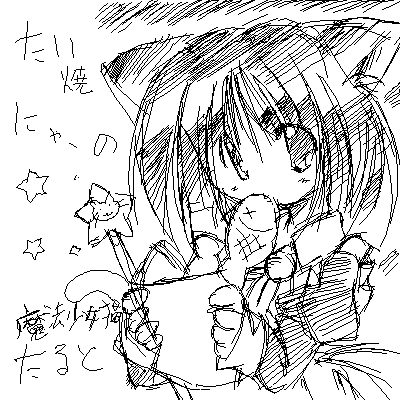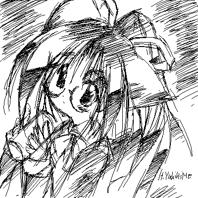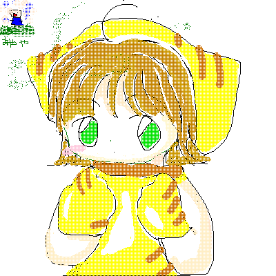 またまた変な絵を描いてしまった・・・・ 今までよりはまだいいほうだと思う。 今回は細いペンで描いて見たり あ、髪の毛のてかりいれんの忘れた・・・・・・ まいいや あやや 2001/5/26 (Sat.) 09:43:14 あ、ちなみにこれ マウスで描きました あ、それと上のほうにあるの気にしないでね なぁ〜んとなく落書きで描いたものだから うん 黄緑 根無 2001/5/28 (Mon.) 01:05:50 上の・・・ 気になりますっ かなり・・・(笑) なんだろう〜。( ̄〜 ̄)? トラさんかなぁ〜。着ぐるみ〜。 (^-^) けっこうすきです〜っ(笑) もか 2001/5/28 (Mon.) 22:27:36 ぷちこ風味でカワイイにゅ(*^^*)