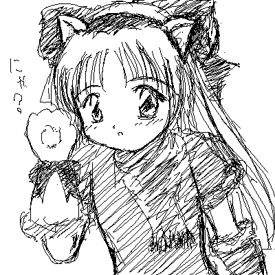 眠い・・・ 筋肉痛でつらいのでレスは明日に。。。 ほかのとこに少しカキコしてますが・・・(汗) すみませんっ 今日でコミケのための早朝バイトは最後です〜。ふぅ やっとおちつける・・・ コンサートのあと、寝ないで仕事したからか、筋肉痛になってなかった感じだったので、ふつうに仕事したんですが・・・ 今、かなりの筋肉痛に・・・(>_<) まり姉のコンサートであそこまであばれられたのは始めてだからなぁ〜。 (*^-^*) しかも野外・・・ 今思うと恥ずかしすぎる・・・ それにしても、この ナコねこにゃんこは一体・・・ にくきゅうって、どうやってかけばいいんだろ・・・ というか、マフラーしてるし。(^-^;;;) 黄緑 根無 2001/8/1 (Wed.) 20:18:21 お絵描きあ・・・ 危うく、自分のにレスしてしまうとこでした・・・(T.T) すぬ [Home Page] 2001/8/16 (Thurs.) 22:03:53 かわいい! すごいなぁ。 こーゆー絵ってどのくらいの時間で 描けるのですか? 黄緑 根無 2001/8/18 (Sat.) 01:40:24 これは30分くらいです。 手抜きして・・・ 顔だけで、1時間越えるときも有ります。(^-^;;;) タブレット苦手で・・・ フルカラーにすると、2、3時間はかかるるかもです。遅すぎ・・・(汗) 手書きならけっこう早いけど、他の人よりは かなり遅いと思いますよ〜。 黄緑 根無 2001/8/18 (Sat.) 01:41:47 あ。もしかしたら、10分くらいで速攻に仕上げたかも・・・ これ。(^-^;)