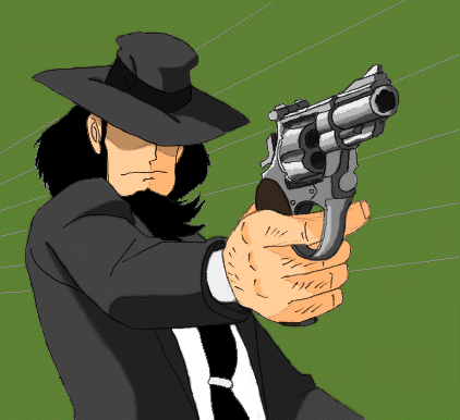 次元は難しい・・・なぜなら次元は銃とセットだからだ。 私は銃に詳しくないのでマグナムは山上正月さんの 「ルパン三世Y」を参考にさせて頂きました。 この絵が正しいかどうかは自信が無い・・・ゆるしてね! 2000.2.20