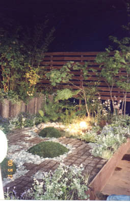 これは、芝生の山の丸と池の丸への 丸の繋がりの写真です。 本当は、芝生の下からライトアップ する予定で設計していたんだけど、 光が透けるように考えて種から育て ていた芝シートが直前にカビに冒さ れてしまったので、急遽市販の芝シ ートを使いました。だから、中から のライトアップは出来ませんでした ちょっと残念でしたね。 |