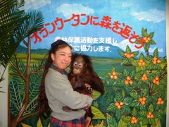 私たちは3ポーズ+CD−Rプレゼント+申年生まれサービスということで、4枚の写真+CD−Rをいただきました。さらに、オランウータン保護基金に募金すると、オランウータンとの写真を1枚サービスしてくれるので、もう1枚よけいに撮影できました。