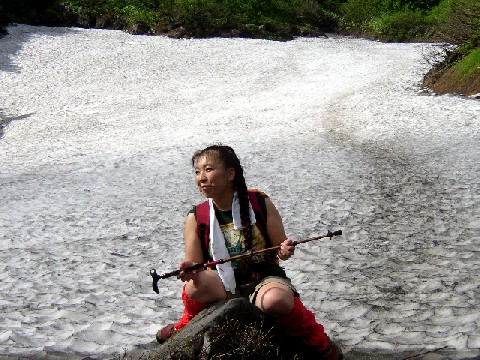 祓川神社を過ぎると石がごろごろする結構急な坂道、ここを登っていくと六合目「賽の河原」。平年ならこのあたりには雪渓はないそうですが、今年は賽の河原の手前から雪渓がかなり残っていました。冷夏を感じた瞬間でした。雪渓を越えて、賽の河原に着いて、宿で作ってもらったおにぎりで朝食(8:20〜8:33)。