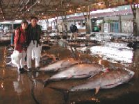 30分に宿をチェックアウトし、勝浦漁港に行くとまさにマグロの水揚げがされたところで、7時くらいからセリが始まりました(右の写真は一番大きなマクロで200kg超です。クリックすると拡大表示します)。