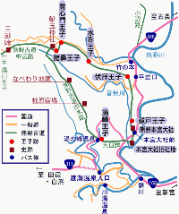 午前7時に宿をチェックアウトし、伏拝王子跡へ向かいました。川湯温泉からは奈良交通の大和八木駅行き特急バス(7:02,8:02,9:02の1日3本)で、竹の本バス停で下車です。車の場合は「道の駅奥熊野古道ほんぐう」がわかりやすいでしょう。田辺市のホームページにモデルコースなどの情報があります。