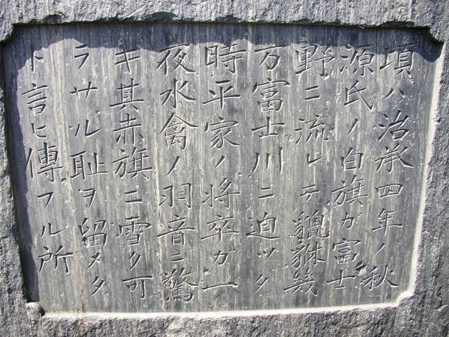 さらに街道を進んでいくと、平家越の碑があります。源平時代、源頼朝討伐のための平家の軍勢がこのあたりに陣をしいていて、水鳥の群れが一斉に飛び立ったのを源氏の軍と勘違いして逃げ帰ったという富士川の合戦の場所です。富士川まではかなりあるので、「え、こんなところ?」と思いましたが、碑の説明によると平家が陣をしいたのは富士沼という湿地帯で、水鳥も多かったようです。