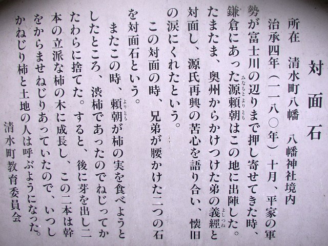 それから約20分、八幡神社の入口に「対面石」の看板が…。源頼朝と義経の兄弟が初めて対面したときに腰掛けた石があるそうです。興味を持ったので見物に行きましたが、神社の境内にこじんまりとした石が2つあるだけでした。むしろ、神社の社殿の方がユニークで、近づくと自動ドアが開き、賽銭箱が現れて中に灯りがともるというモノでした。