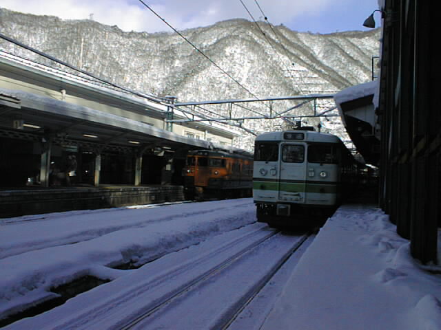 水上に到着し、これから新潟行の各駅停車(写真右)に乗り換えます。この辺りで積雪30〜40cm程です。