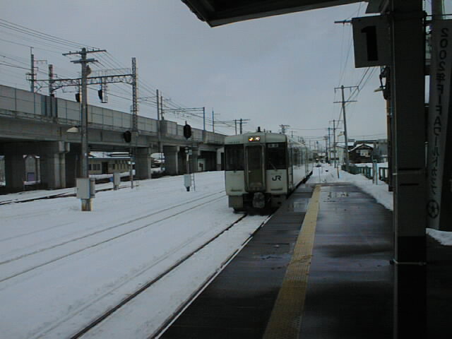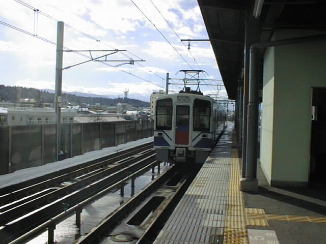 なんか、ここの私鉄(北越急行)は速いゾ。つららよけまであるし・・・。