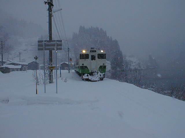 対向列車が5分程遅れて、雪をかき分けやってきました。 |