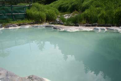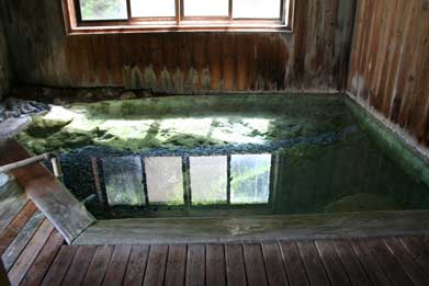 ら源泉が湧出している。露天風呂は内湯から湧出された温泉が使用されている。やや白緑色の温