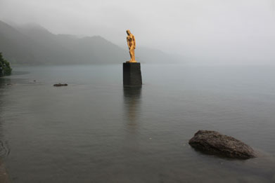 田沢湖は周囲20kmで、水深423.4mの日本一深い湖である。たつこ像は田沢湖の西側にあり、 岸近くの湖の中には金色に光るブロンズ像がある。願いを叶えるために霊泉を飲み続けたら竜にな ってしまったという辰子姫伝説もある。このブロンズ像は、田沢湖のシンボル的存在となっている。