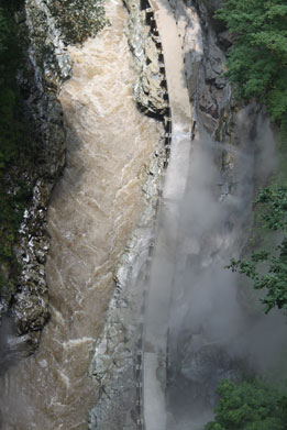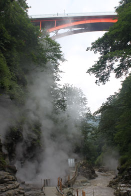 皆瀬川にある渓谷で、全長4kmほど続いている。一番の見所は大噴湯で、川沿いの岩肌から熱湯 が噴出し、大量の白い蒸気が噴き上がっている。付近を遊歩道で通行出来るが、視界が悪く息苦し いほどである。真上には川原湯橋があり、60mほど高い位置から大噴湯やV字渓谷を見下ろすこ とが出来、とてもスリルがある。その他周辺には不動滝を始めとした大小さまざまな滝がある。