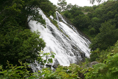 80mの断崖を勢いよく滑り落ち、海に流れる滝である。日本の滝100選にも指定されている。駐車