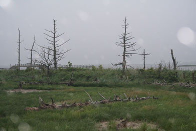 トドワラは野付半島の奥の方にある観光スポットで、トドマツの森が海水によって侵され風化した白