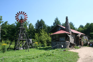 屋、羊の小屋、風車、石の家、五郎さんの最初の家などがある。赤い羽根の風車は、五郎が自力で