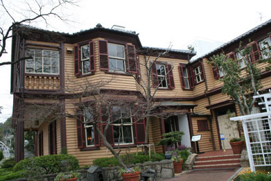 旧ドレウェル邸で、張り出したベイ・ウィンドウや開放されたベランダなど、明治期の異人館様式を受 |